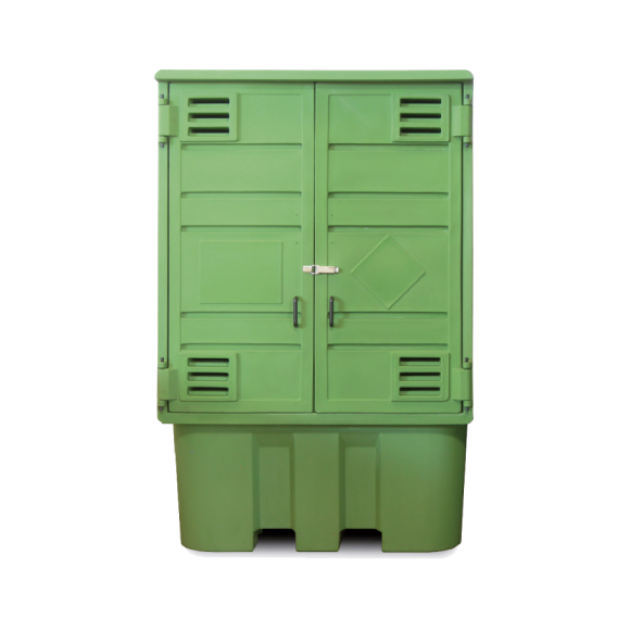 La cisternetta IBC si posiziona direttamente sul grigliato di appoggio interno. L’Armadio è dotato di doppia porta a battente con chiusura a leva, predisposta per lucchetto, per massima sicurezza. Inoltre, è inforcabile da tutti i lati con carrello elevatore o transpallet, nonostante il suo peso di 200 kg.