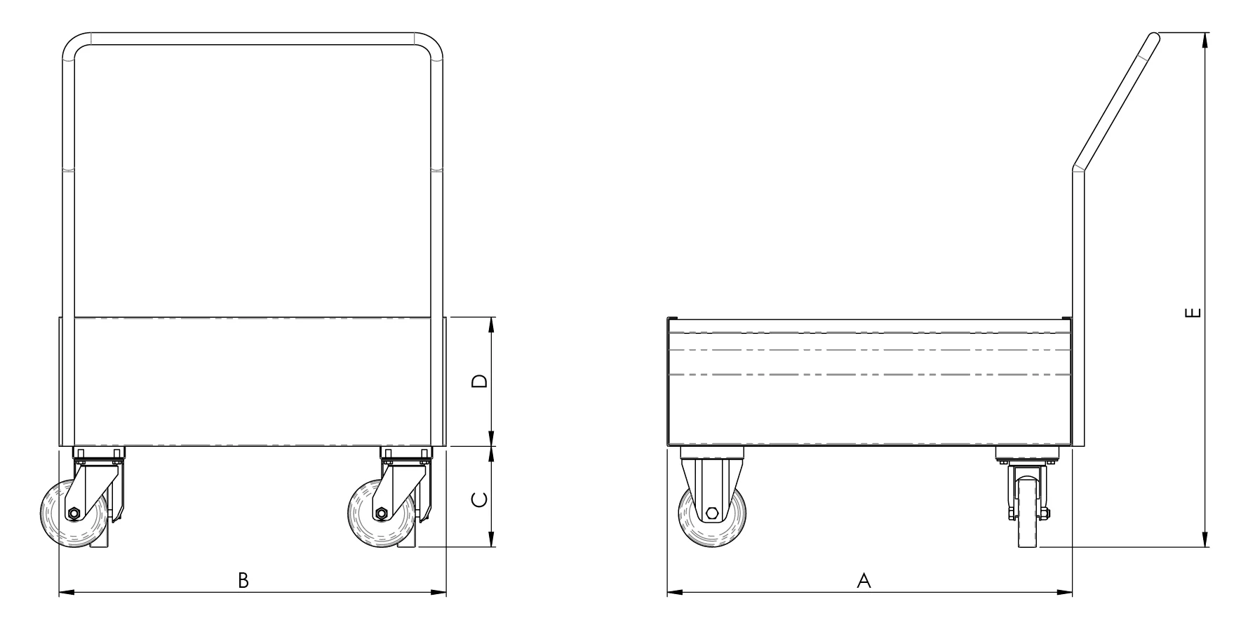 A=Lunghezza, B=Larghezza, C=Altezza utile, D=Altezza ruote, E=Altezza totale, Le misure sono espresse in millimetri.