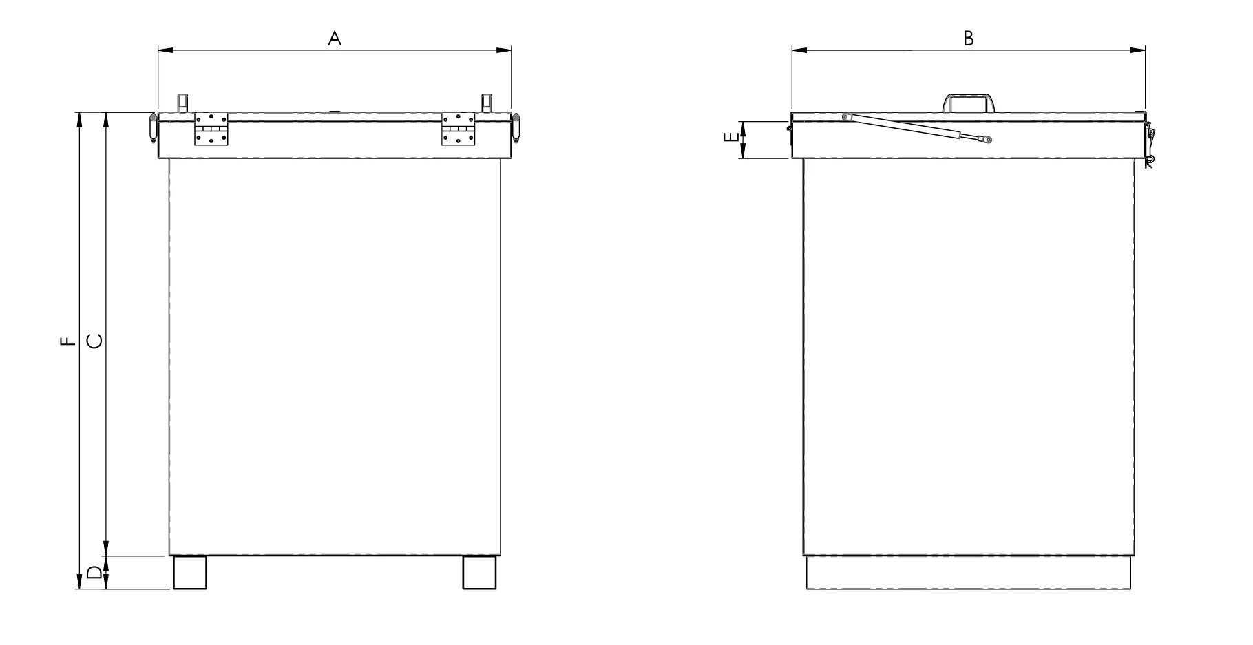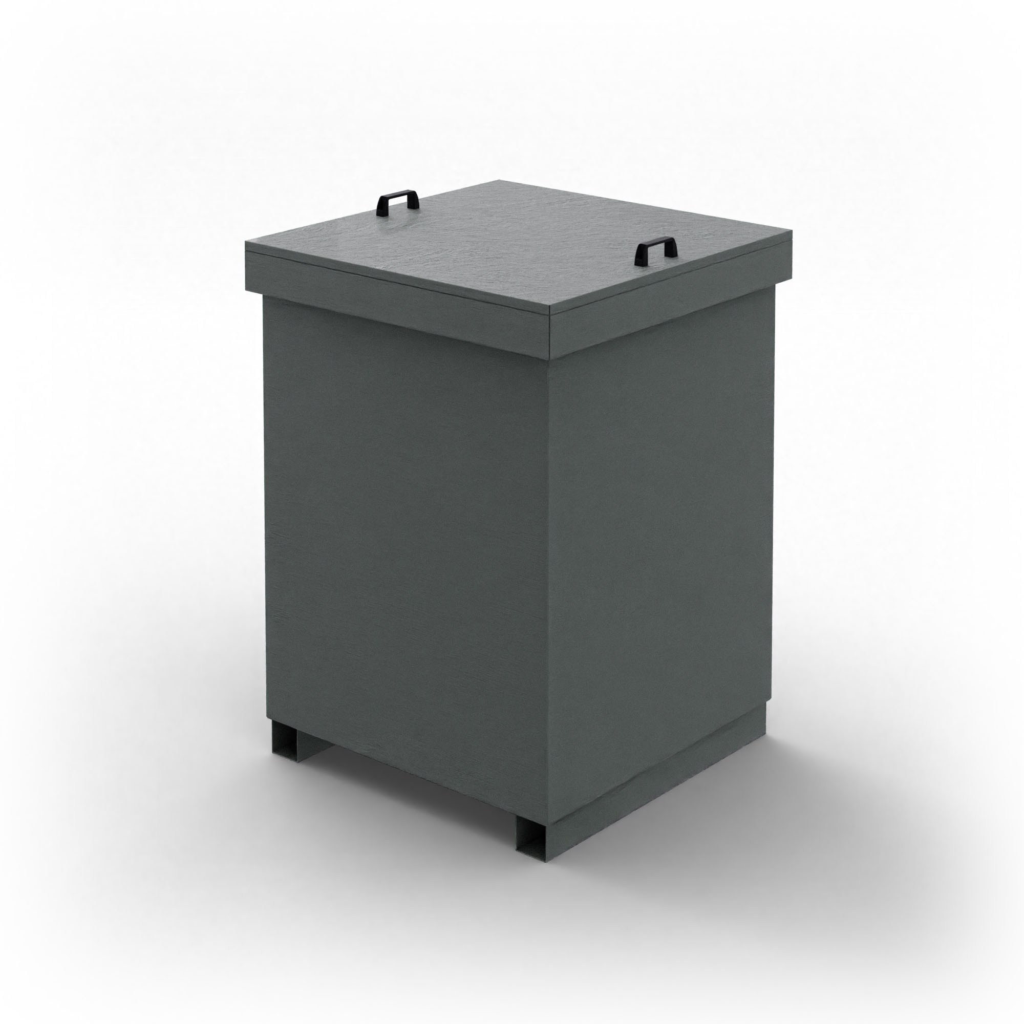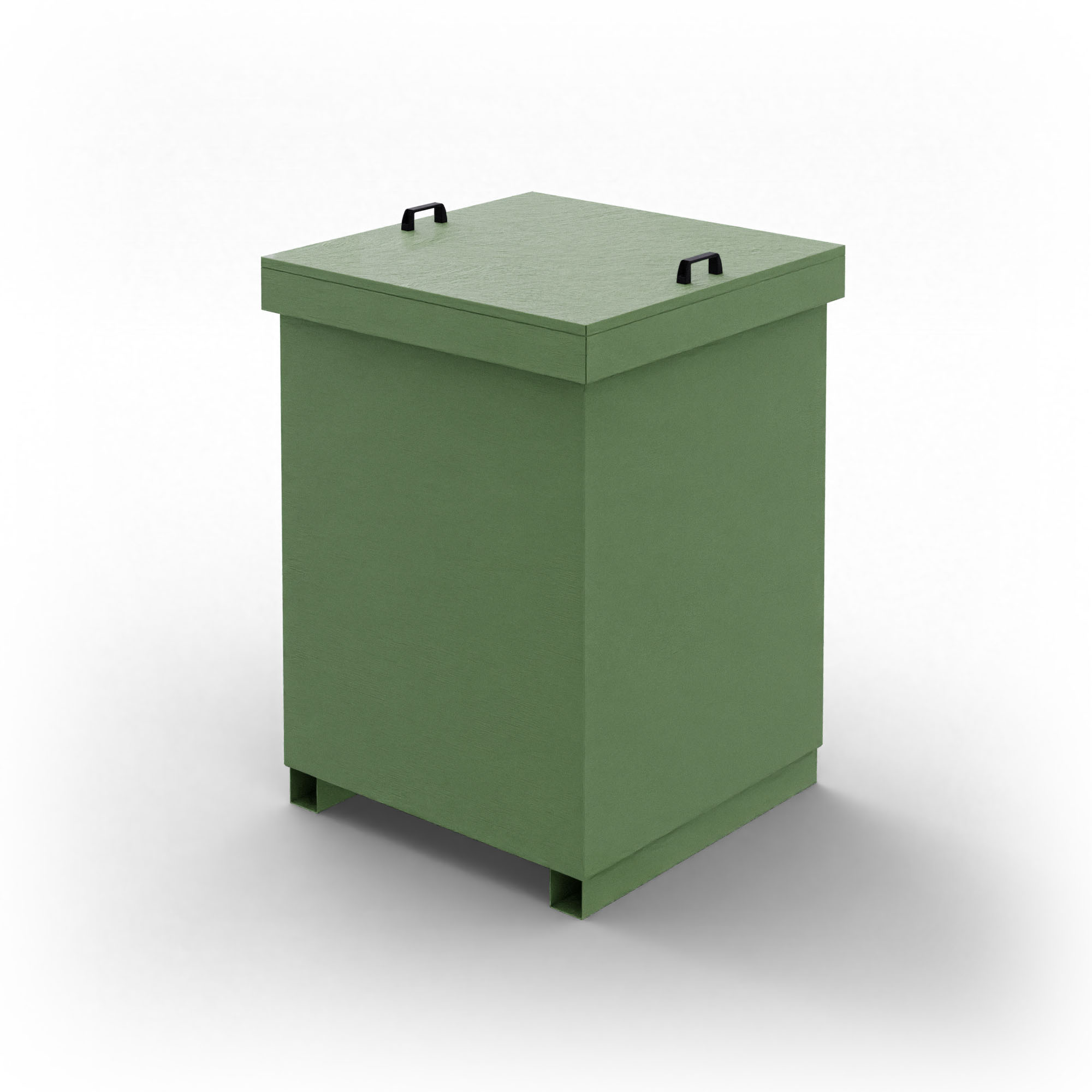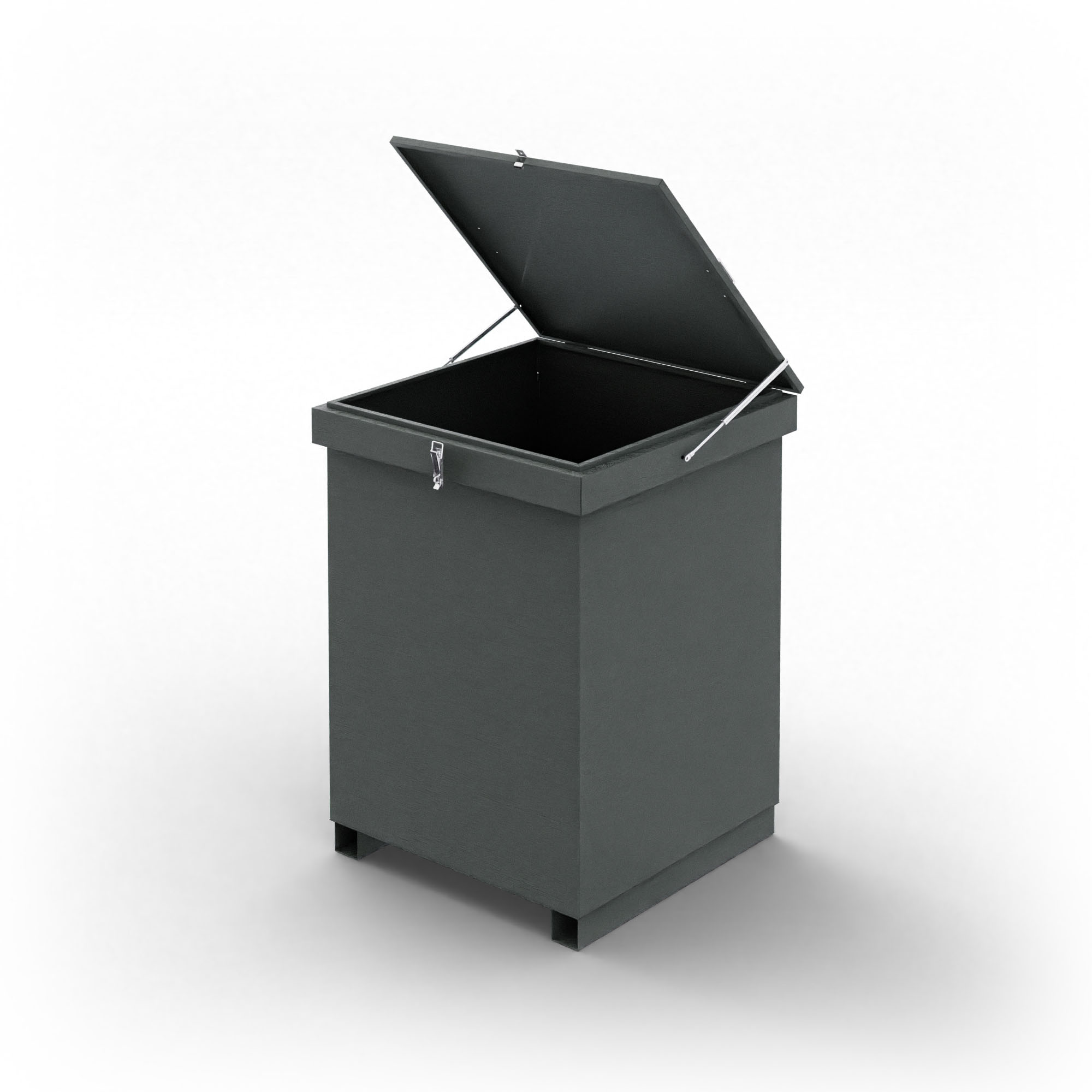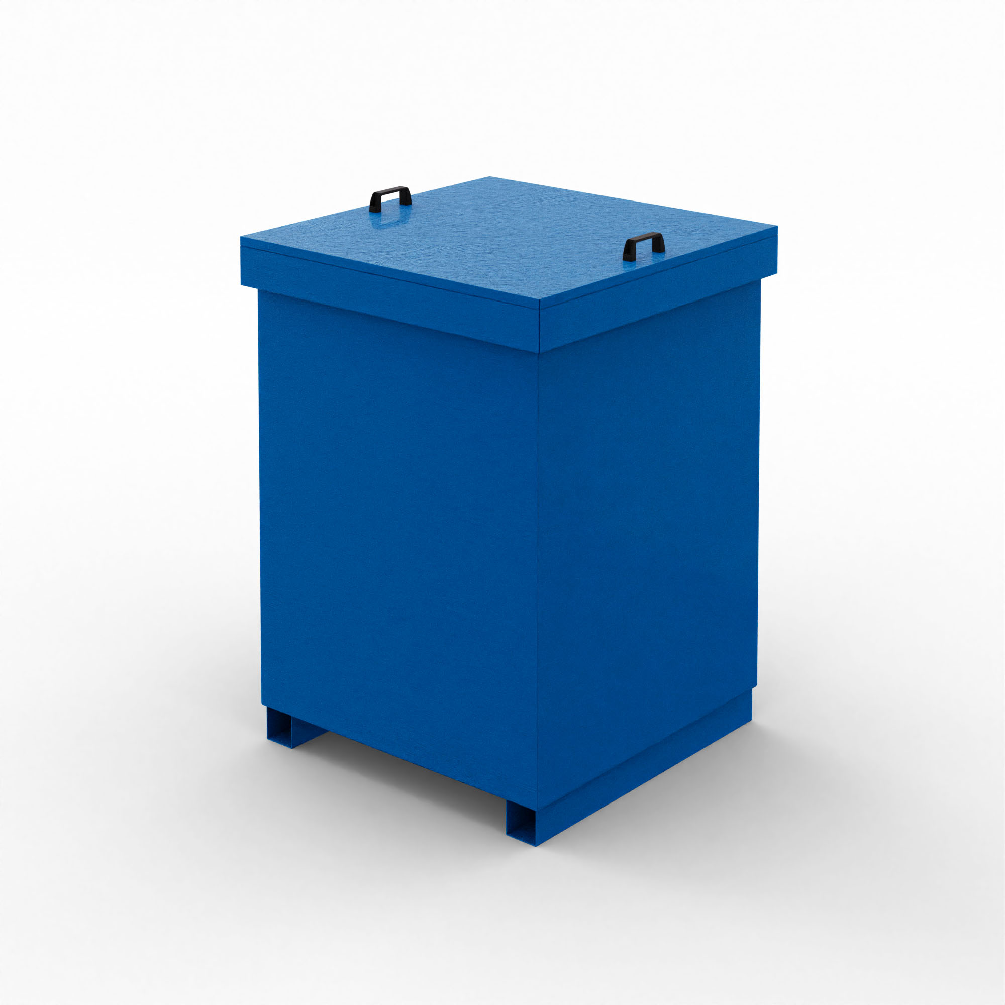 Il contenitore è realizzato in acciaio S235JR o superiore, assicurando durata e resistenza nel tempo. È dotato di 4 moschettoni sui lati per l’aggancio dei sacchi e di un coperchio incernierato servoassistito. La struttura può essere movimentata facilmente con carrello elevatore o transpallet grazie agli inforcamenti alla base.
