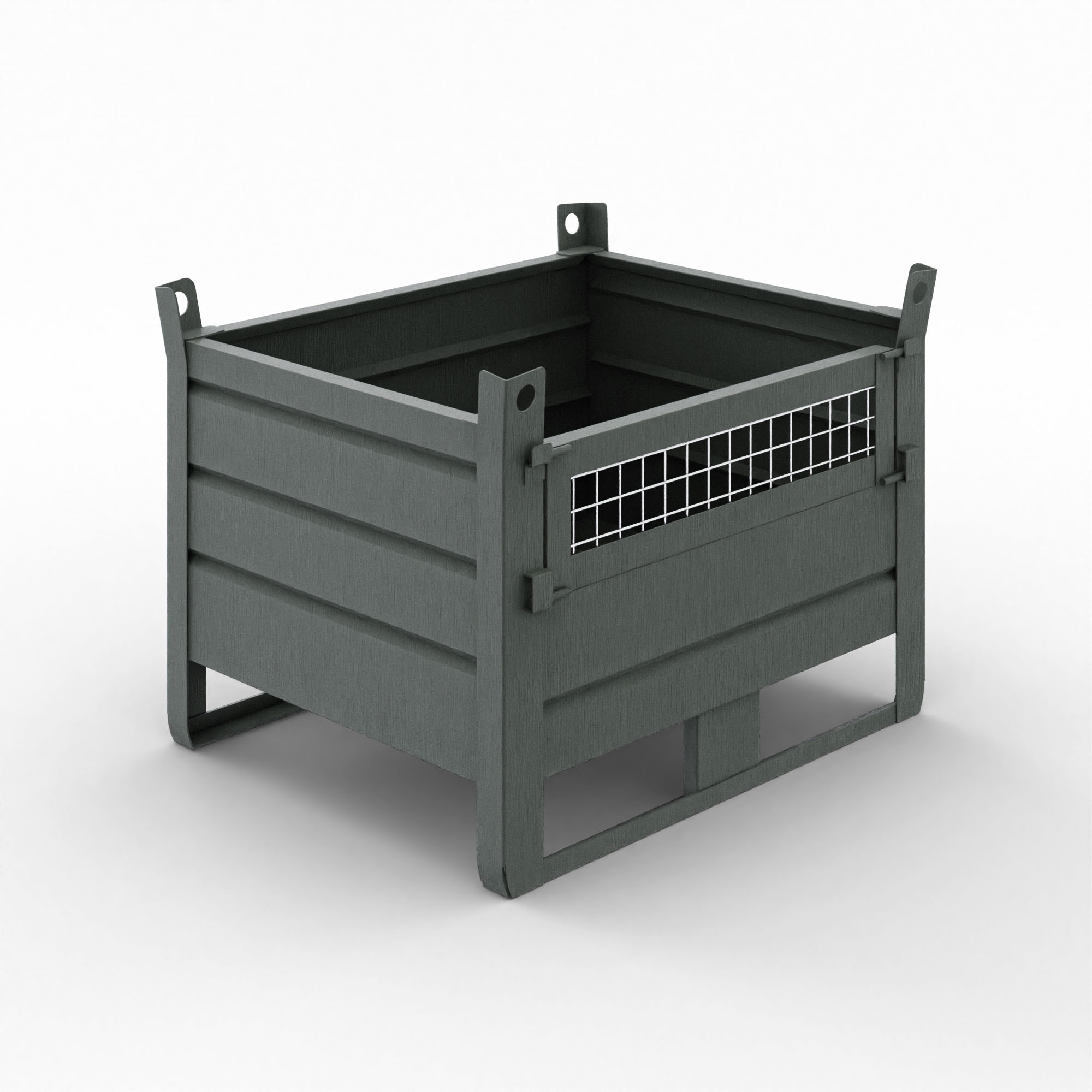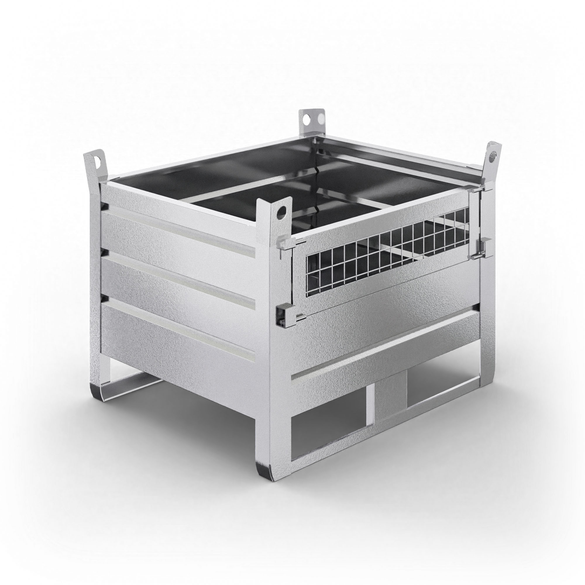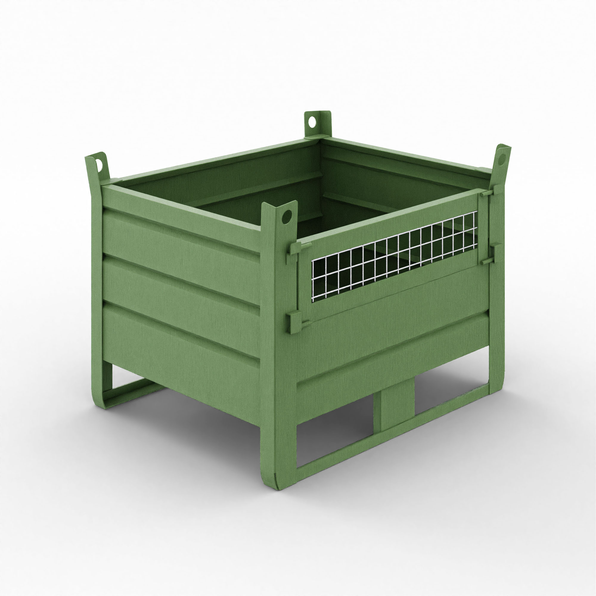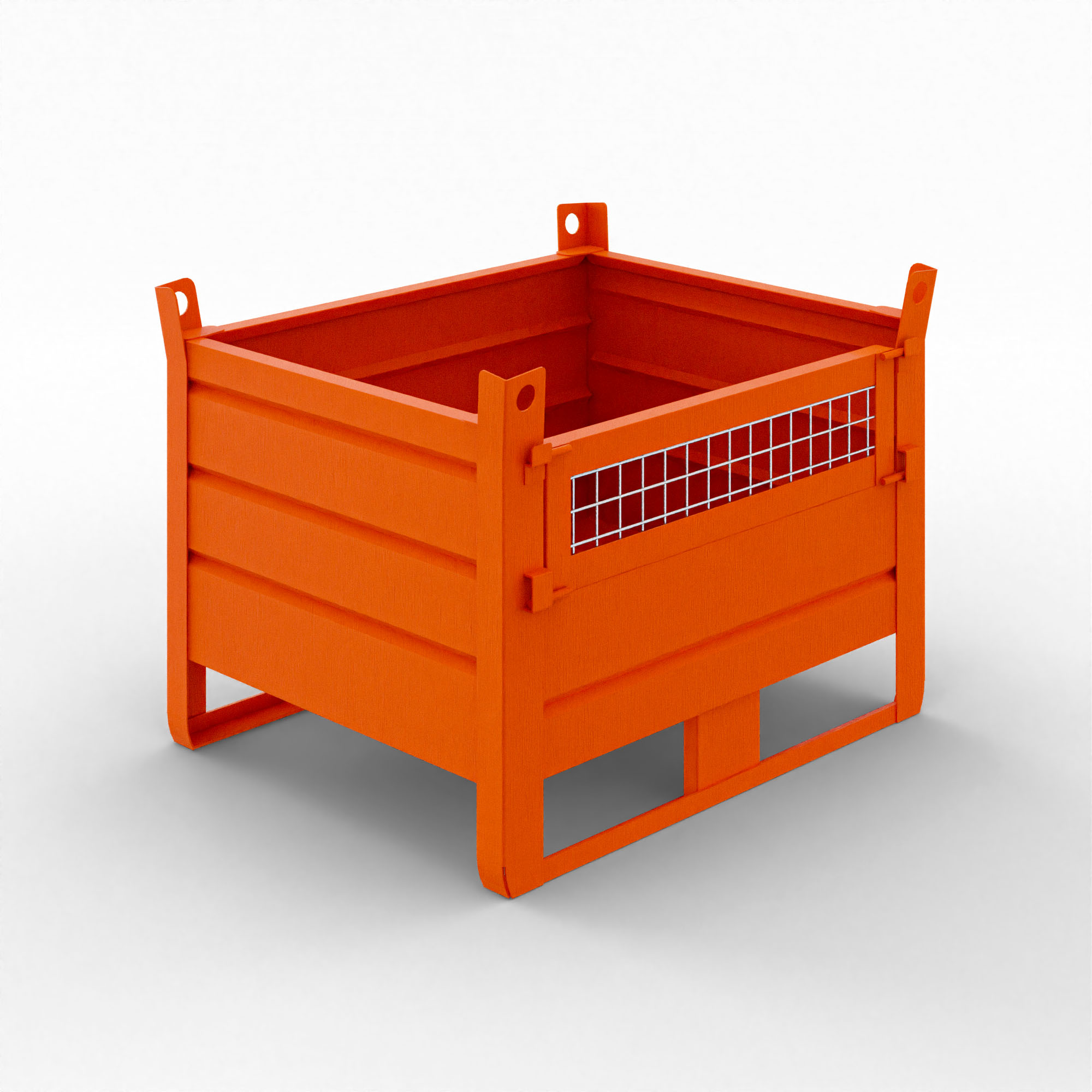 Ogni contenitore è costruito in acciaio S235JR o superiore. I materiali provengono da fornitori certificati UNI EN ISO 9001, garantendo tracciabilità e qualità costante. Inoltre, l’anta apribile in rete elettrosaldata, posizionata frontalmente o lateralmente, semplifica le operazioni di carico e scarico. Così da ottimizzare tempi e spazi in magazzino.