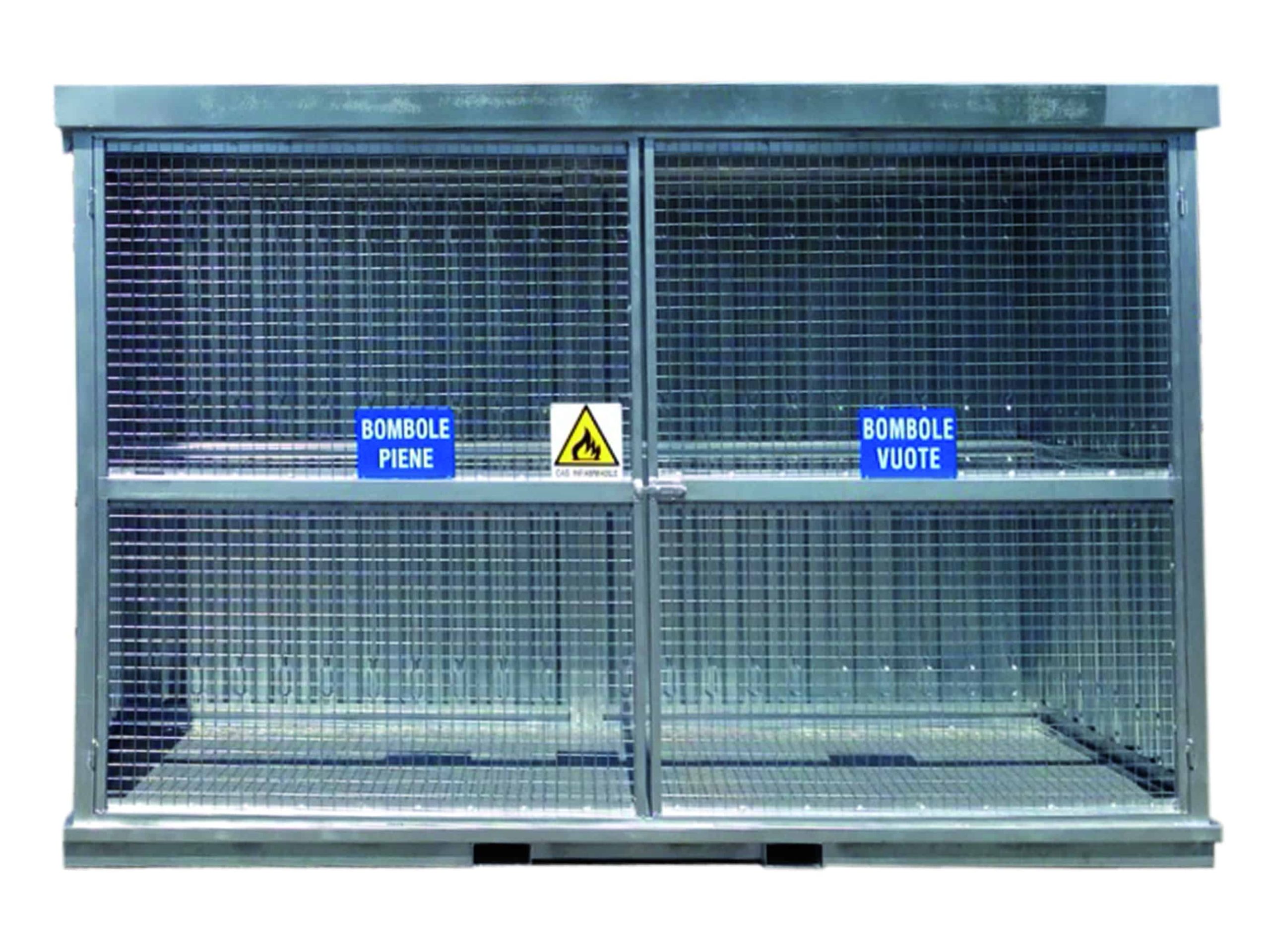 La porta a doppio battente con chiusura di sicurezza offre un’apertura ampia (h 1910 mm), facilitando il carico anche con transpallet. All’interno, le bombole possono essere stoccate singolarmente o su pallet, in posizione verticale e bloccate con catenelle, come richiesto dalla normativa per evitare ribaltamenti.