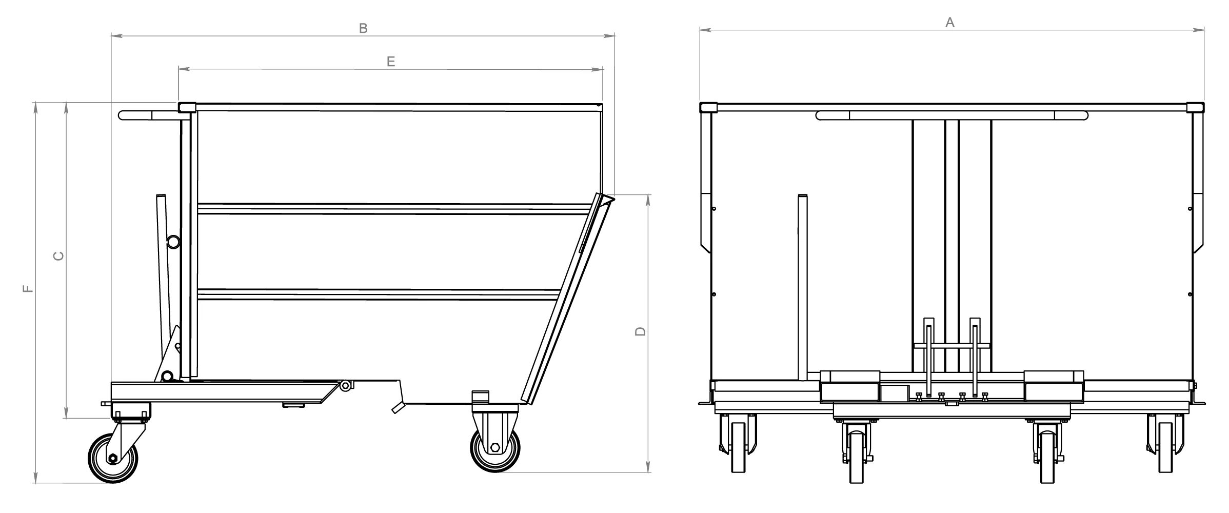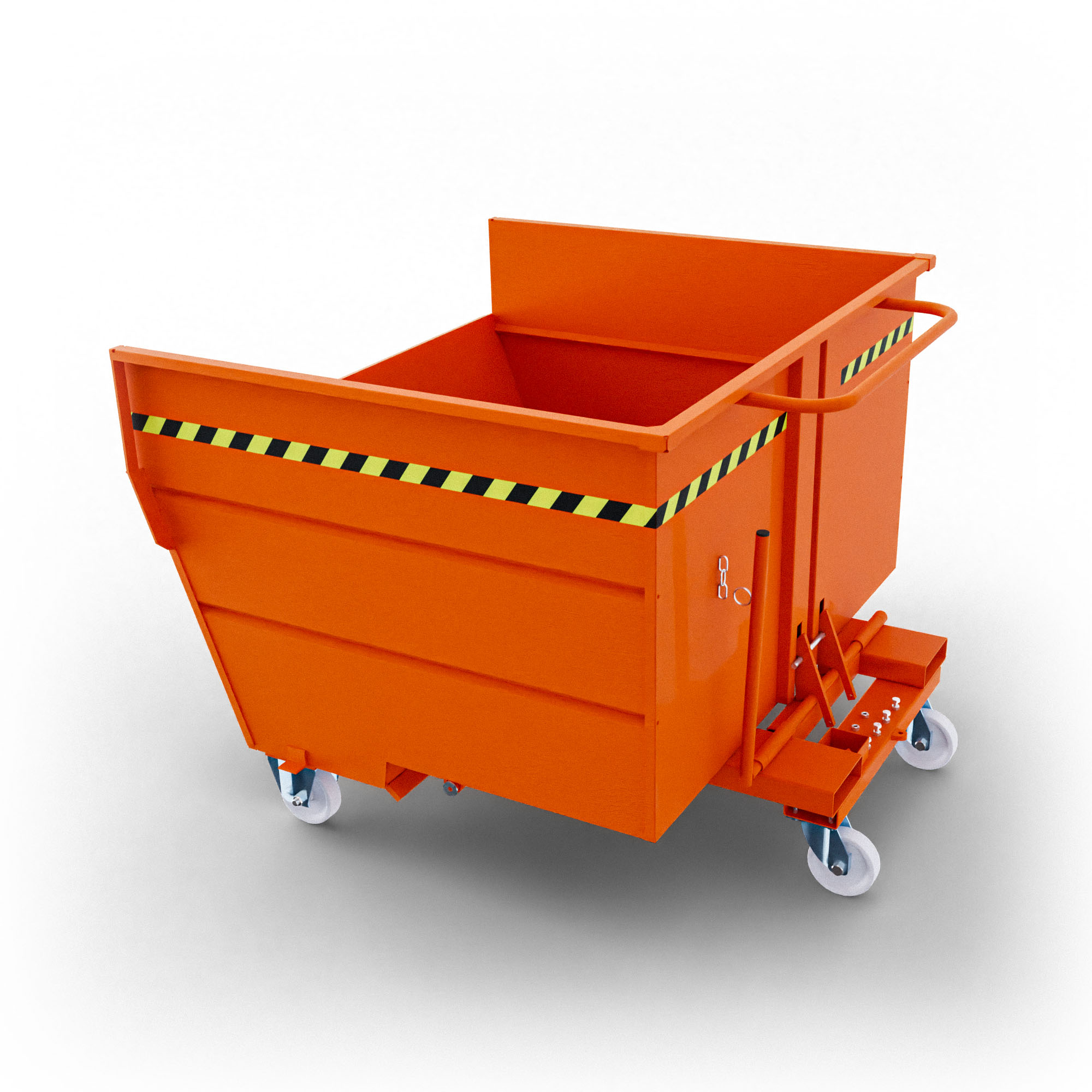 La benna ribaltabile con ruote Needcontainers dispone di doppio inforcamento, così da poter essere sollevata e trasportata con facilità tramite carrello elevatore. Inoltre, l’operatore può scaricare la benna restando comodamente seduto al posto di guida, azionando la leva di sgancio tramite cavo, garantendo sicurezza e praticità in ogni operazione.