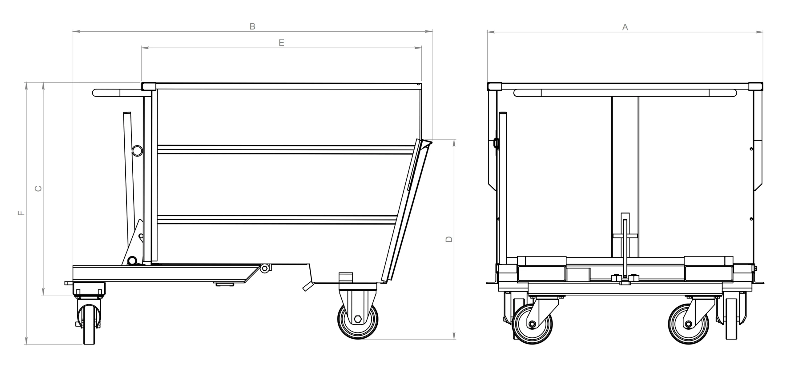 Le benne Needcontainers vengono fornite con ruote in nylon (2 fisse e 2 piroettanti), catena e moschettone di sicurezza. Inoltre, per rispettare le normative di sicurezza, l’operatore può scaricare la benna rimanendo seduto sul carrello elevatore, azionando la leva tramite apposito cavo.