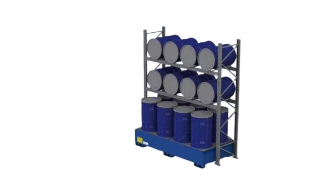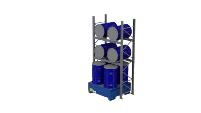 Grazie alla sua struttura modulare posizionata sopra la vasca di contenimento, questa Scaffalatura di Needcontainers permette di combinare fusti in posizione orizzontale (per spillatura rapida) e verticale (per massimizzare lo spazio), adattandosi a qualsiasi esigenza operativa. Il sistema si monta direttamente sulla vasca di raccolta, creando un’area di contenimento secondario conforme al Decreto Ministeriale 18.05.1995.