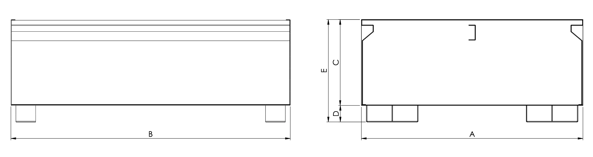 A=Lunghezza, B=Larghezza, C=Altezza utile, D=Altezza del piede, E=Altezza totale, Le misure sono espresse in millimetri
