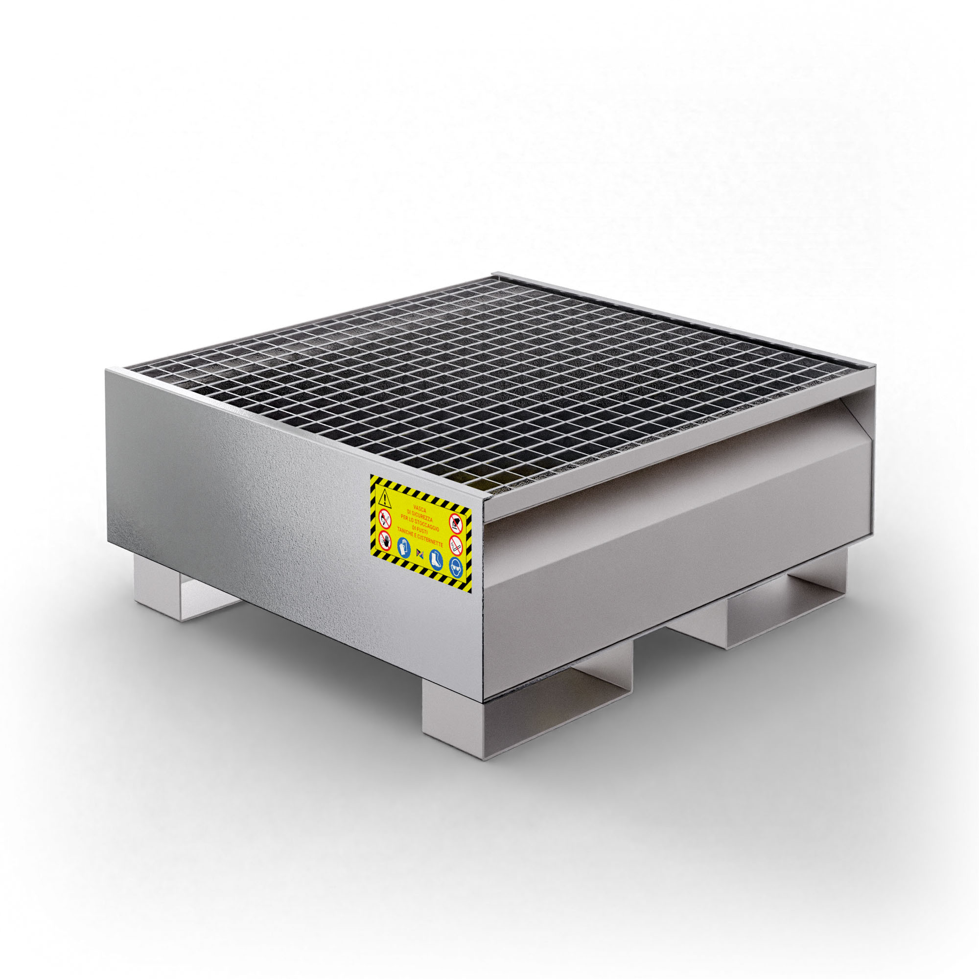 Il grigliato superiore è in acciaio zincato a caldo e pressato. Questo lo rende resistente al carico, alla corrosione e all’usura quotidiana. Infatti, sopporta facilmente il peso di fusti pieni e il passaggio di operatori. Proprio per questo, è ideale sia per interni che per esterni.