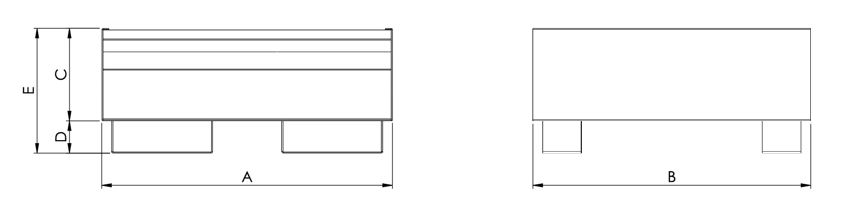 A=Lunghezza, B=Larghezza, C=Altezza utile, D=Altezza del piede, E=Altezza totale, Le misure sono espresse in millimetri