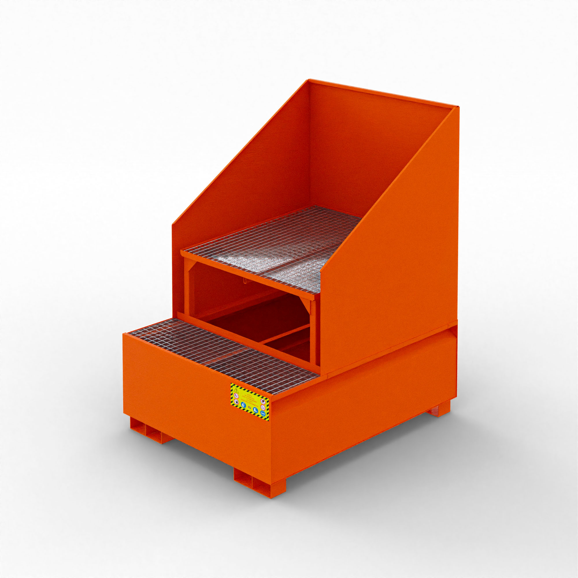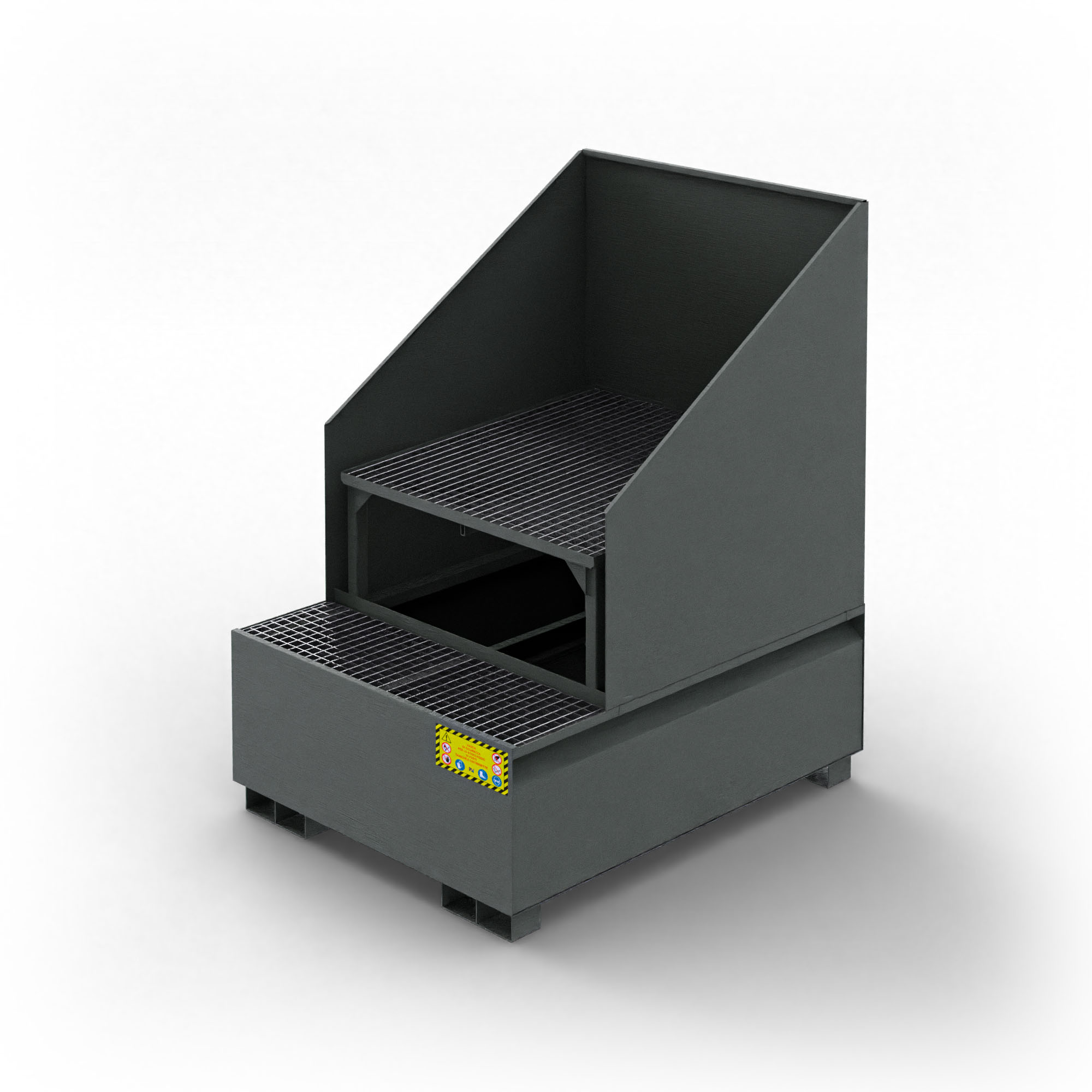 Realizzata in acciaio al carbonio S235JR o superiore, la Vasca inclinata di raccolta ha uno spessore di 3 mm (30/10). Le saldature sono controllate elettronicamente per garantire tenuta stagna assoluta. Le dimensioni rispettano gli standard UNI, assicurando stabilità anche con carichi pesanti. Per questo motivo, è dotata di entrate per forche, per un sollevamento rapido con carrelli elevatori.